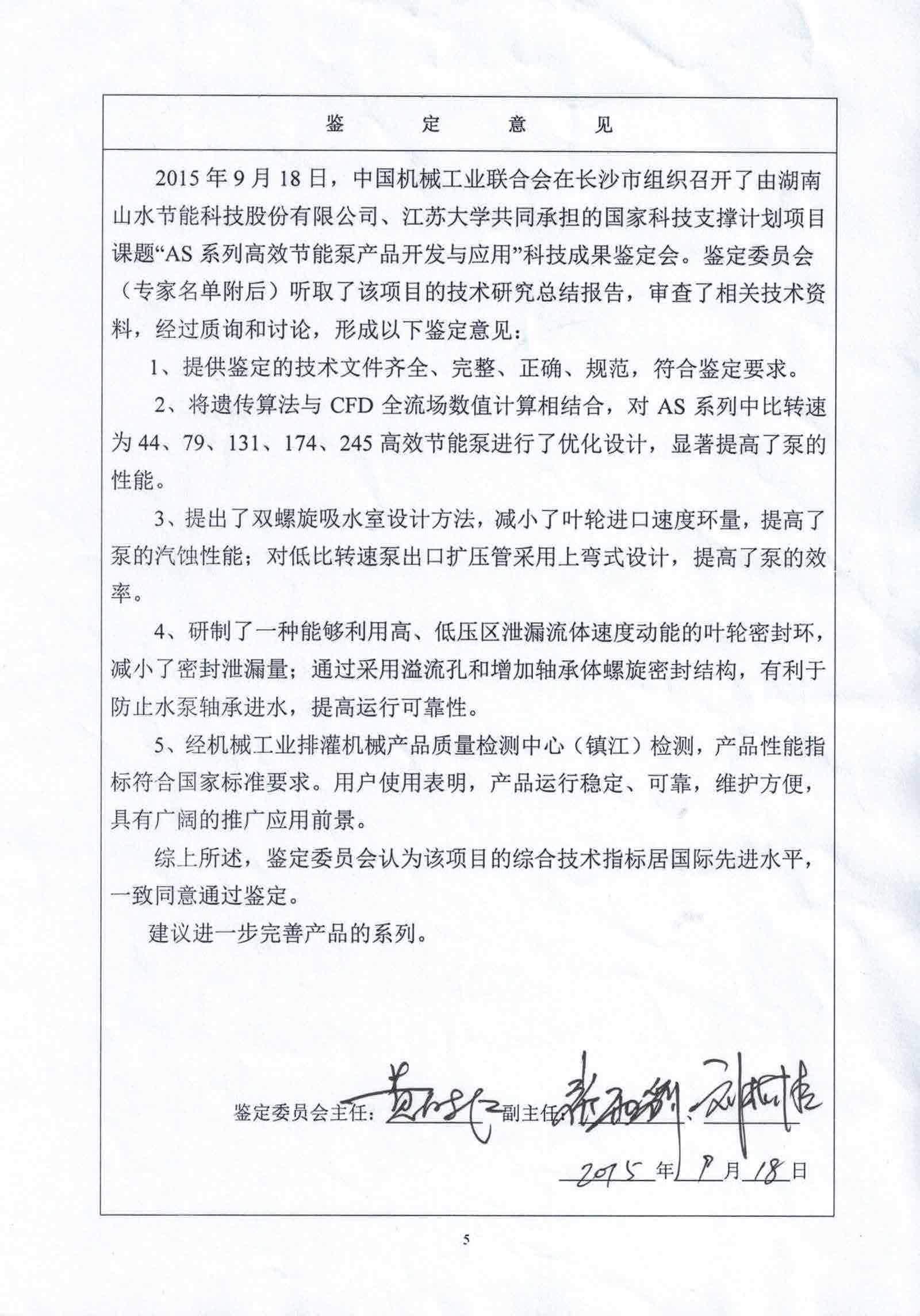 2015年9月18日,中國機械工業聯合會在長沙市組織召開了由湖南山水節能科技股份有限公司、江蘇大學共同承擔的國家科技支撐計劃項目課題“AS系列高效節能泵產品開發與應用”科技成果鑒定會。鑒定會由中國機械工業聯合會馬敬坤處長主持,華中科技大學能源與動力工程學院院長黃樹紅教授擔任鑒定委員會主任,中國通用機械工業協會秘書長張雨豹高工、武漢大學劉梅清教授擔任副主任。委員包括中國通用機械工業協會泵業分會總工程師李樹斌教授級高工、長沙理工大學李志鵬教授、中南林業科技大學張奇志高工以及機械工業排灌機械產品質量檢測中心(鎮江)李偉副研究員。