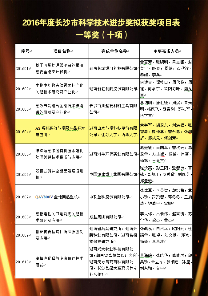 近日,2016年度長沙市科學技術進步獎獲獎項目已全部揭曉。湖南山水節能科技股份有限公司攜《AS系列高效節能泵產品開發與應用》項目喜獲長沙市科學技術進步獎一等獎,是此次水泵行業少有殊榮的企業。