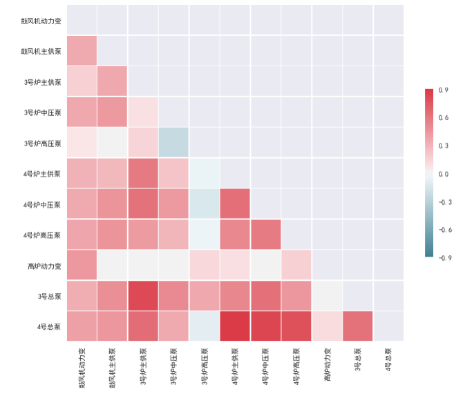 每日電耗相關性分析,主要用于分析具有相互關系的兩個泵站(通常屬于同一個管網,如同一高爐對應的主供泵與中/高壓泵)電耗的相關性,從而交叉對比以了解各泵之間電耗的相互關系,如圖7所示。
