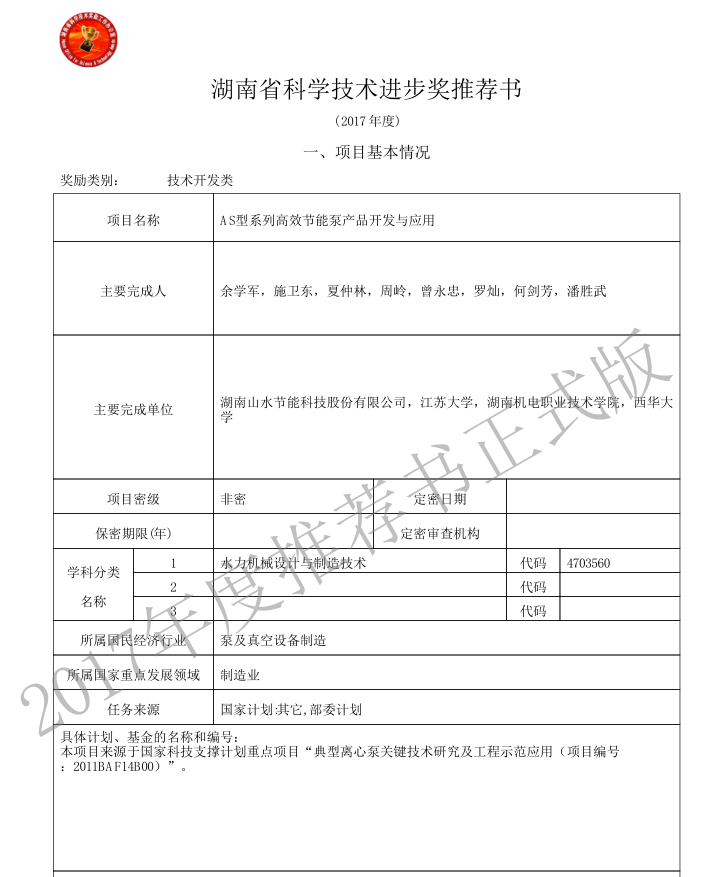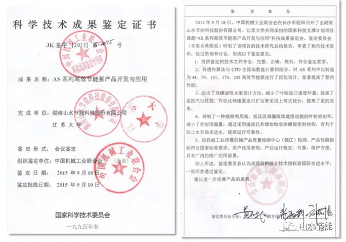 湖南山水節能科技股份有限公司、江蘇大學、湖南機電職業技術學院、西華大學完成的AS型系列高效節能泵產品開發與應用獲得省科技進步獎。
