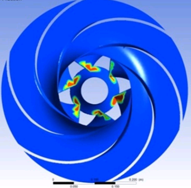 針對(duì)某泵型進(jìn)行汽蝕模擬計(jì)算,得到如下圖的葉輪壁面空泡分布圖。