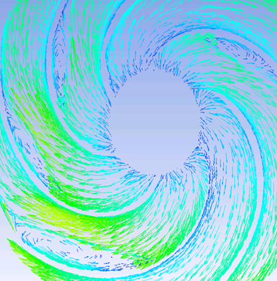 上圖為葉輪XY對(duì)稱面速度矢量圖,在葉輪單個(gè)流道的中間位置出現(xiàn)了漩渦,漩渦的產(chǎn)生將對(duì)水泵的性能產(chǎn)生較大影響。因此,需要改善葉輪流道內(nèi)部的流場(chǎng)分布,減少或避免漩渦的產(chǎn)生。