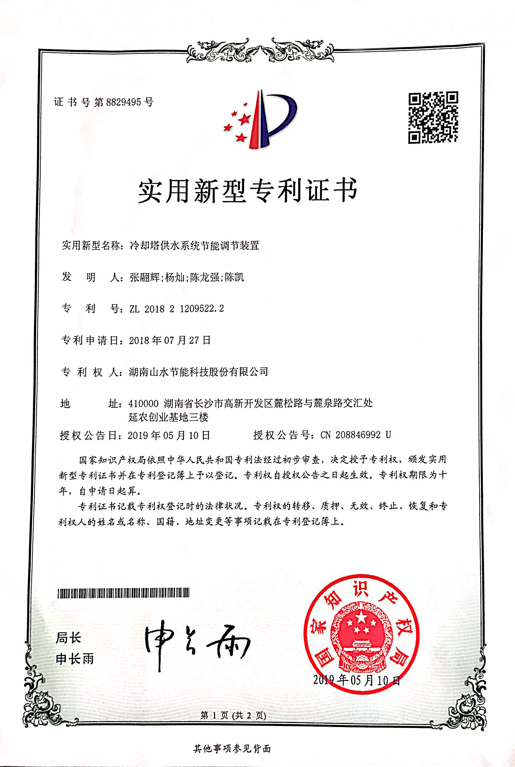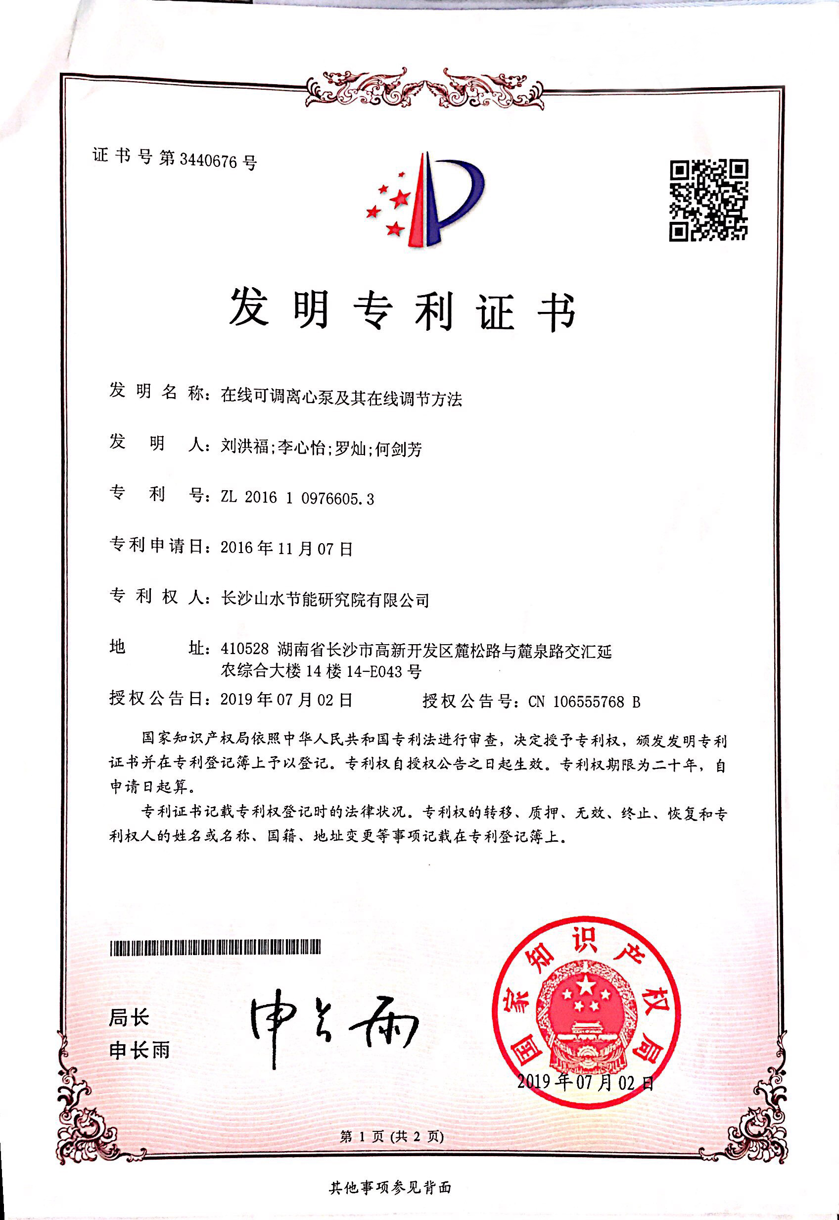 從國家知識產(chǎn)權(quán)局傳來喜訊,由公司自主研發(fā)的“在線可調(diào)離心泵及其在線調(diào)節(jié)方法”、“冷卻塔供水系統(tǒng)節(jié)能調(diào)節(jié)裝置”二項成果榮獲國家發(fā)明專利和實用新型專利授權(quán)。