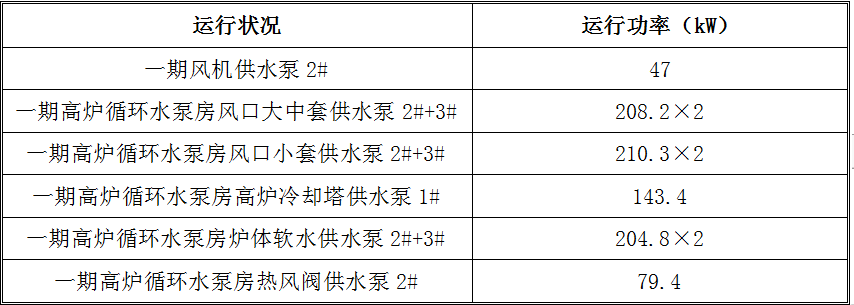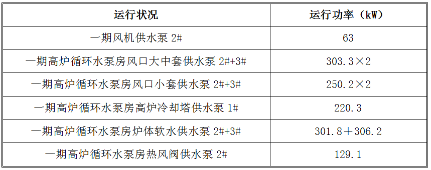 我們針對甲方一期風機供水泵系統、一期高爐循環水泵房風口大、中套供水泵系統、一期高爐循環水泵房風口小套供水泵系統、一期高爐循環水泵房高爐冷卻塔供水泵系統、一期高爐循環水泵房爐體軟水供水泵系統進行現場檢測和調研。發現原系統運行功率偏大。具體如下: