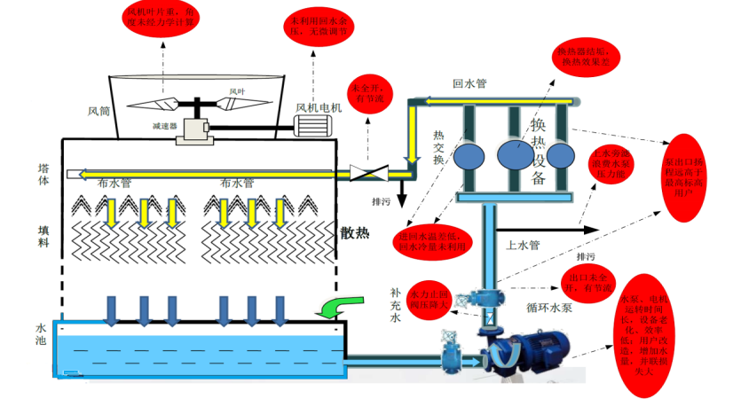 冷卻塔風機系統問題:實行工頻控制,未對風機系統進行有效調節。